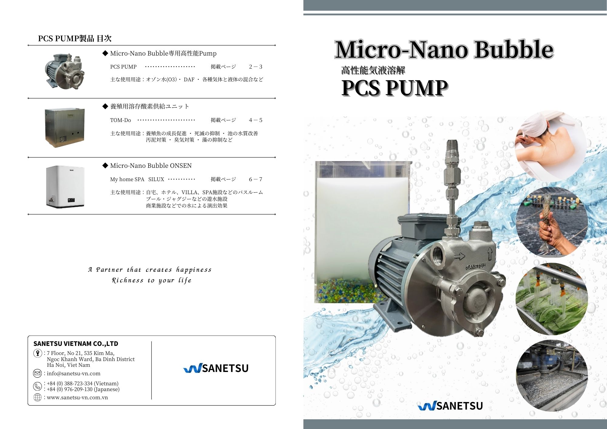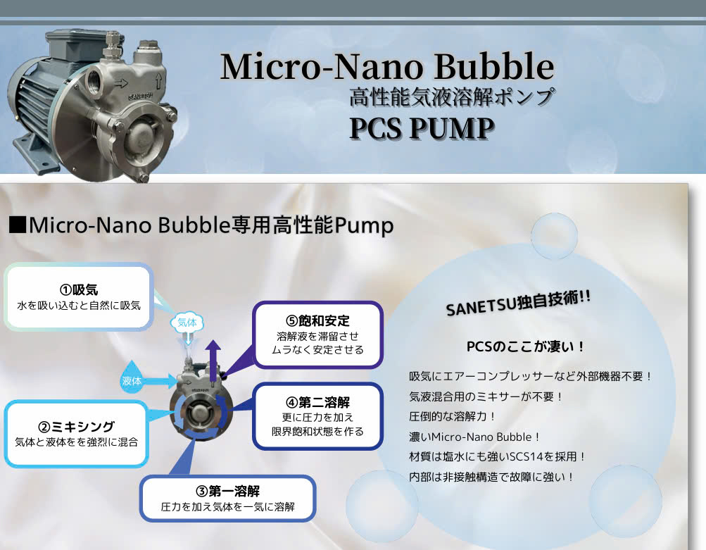 SANETSUのPCSポンプはエアーコンプレッサーなどの外部機器を一切使用せず、PCSポンプ単体の性能だけで大量のMicro-Nano Bubbleを発生させることができるSANETSUオリジナルの高性能ポンプです。