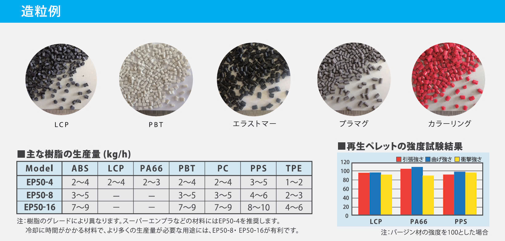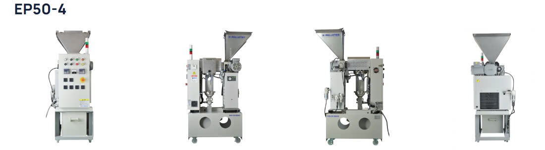 e・PELLETERは、あらかじめ粉砕されたランナーから再生ペレットを製造する装置です。 処理量に応じて、EP50-4、EP50-8、EP50-16 の3つのモデルから選択できます