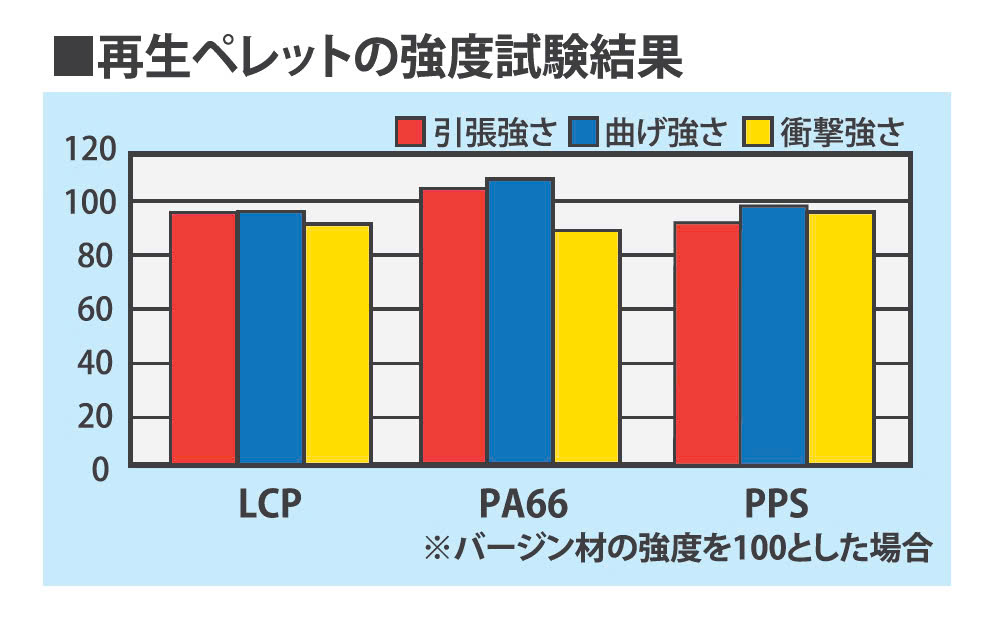 特許による独自設計で高性能ながら低価格を実現。この装置を導入することで廃棄していたランナーの処理費用が削減できるばかりか、再利用することで製品として生まれ変わります。従来のように粉砕材をそのまま再利用すると、どうしても粒度のばらつきが原因で、焼け、黒点、バリなどの不良が出やすいですが、リペレットすることによりその多くが解消されます。